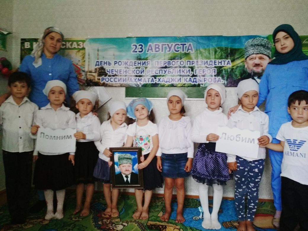 На основании плана мероприятий, посвященных празднованию Дня рождения А.-Х. Кадырова с 16-21 августа 2018г. в МБДОУ «Солнышко» с. Саясан для воспитанников средней группы были проведены тематические беседы, конкурсы и выставки рисунков и в завершении 23 августа состоялось праздничное мероприятие.